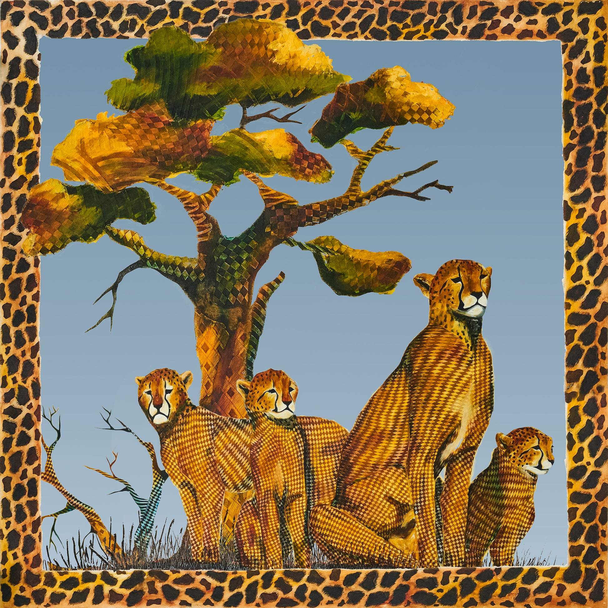 The Etosha Cheetah Coalition is a fantastic full color silk scarf with incredible details. In Kuda's signature geometric pattern interpretation of cheetah spots and the textures in the scene. Based on a real life scene witnessed by the founder in the Etosha National Park when a mother cheetah just missed a kill of a zebra to feed her three cubs. She was teaching them to hunt. You could tell she exerted so much energy in the miss, so she took a break under this little tree. Although she looked a little winded, she sat steadfast and kept scanning the horizon for another opportunity. You could feel her resolution to finish the job and feed her family in how she was sitting. Nature is amazing!