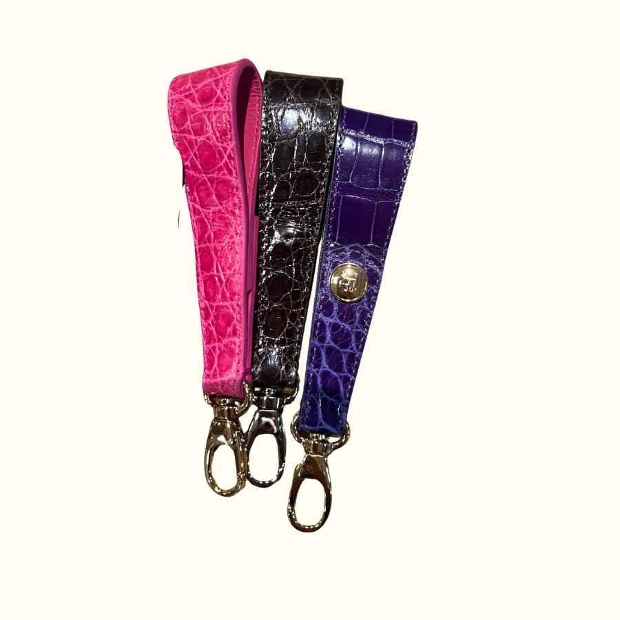 An easy little design to make any wallet, phone case or bag into a wristlet. A great way to add a pop of color to your keychain and also an adorable use of offcuts. Made with wild Amerian Alligator and Italian leather, it makes a cute gift as well.