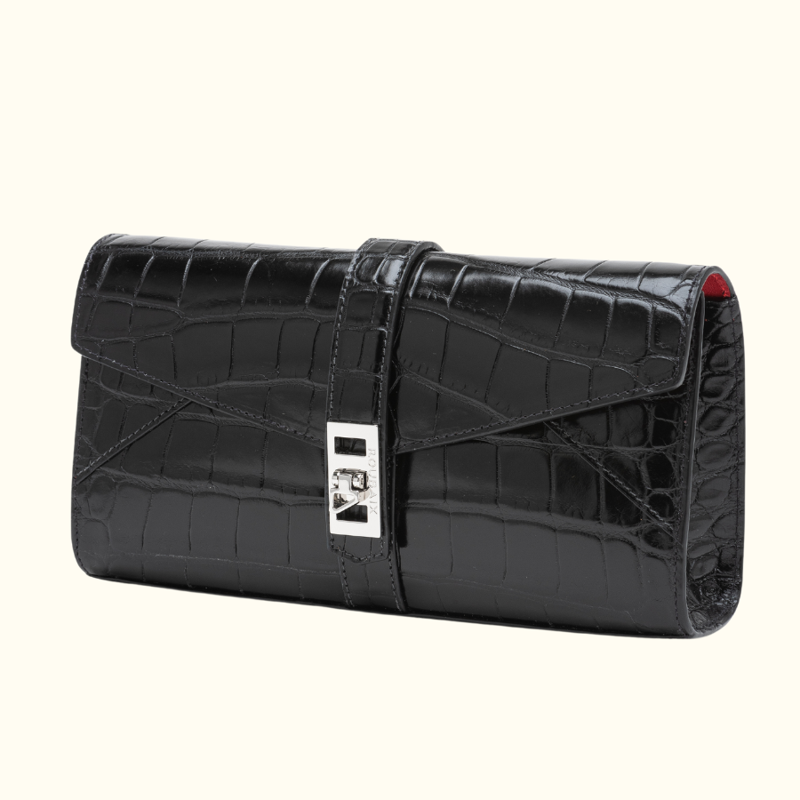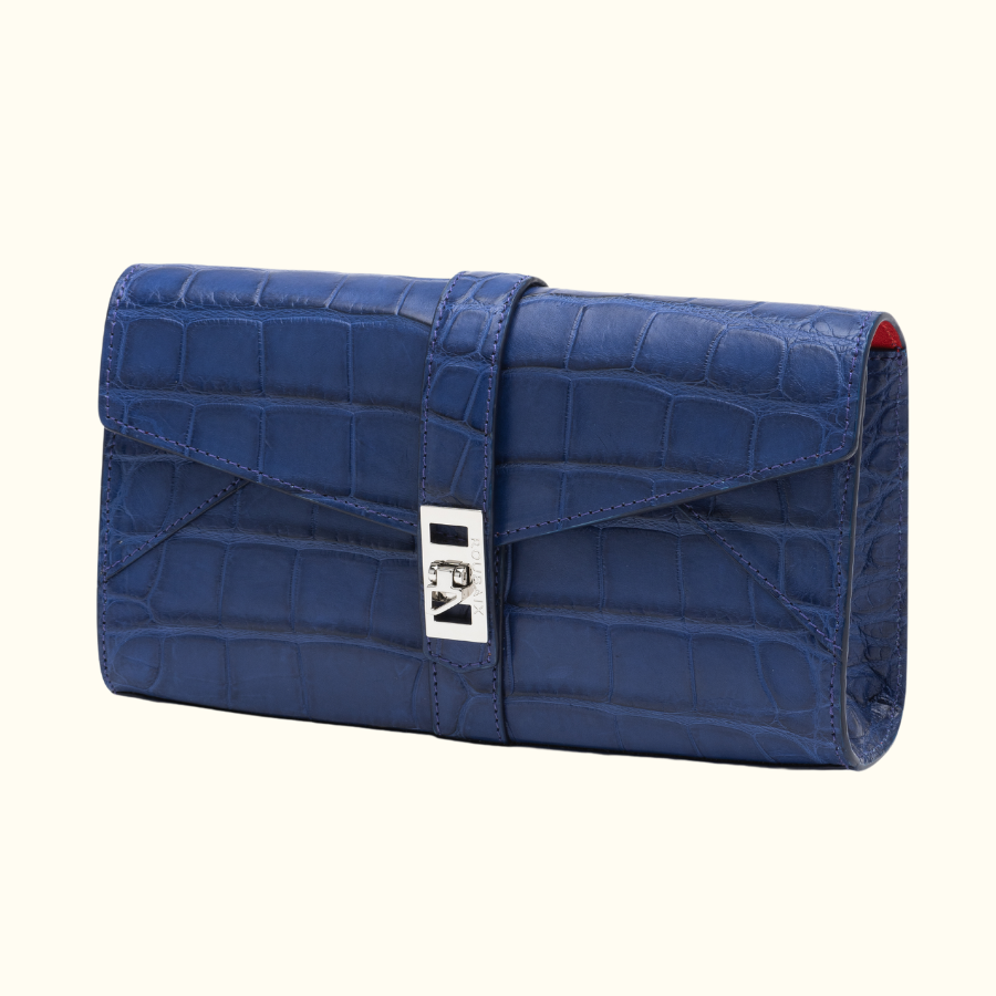 Designed as a classic clutch, The Wyatt is a stunning night accessory that enhances any outfit and holds all of your small accessories for the evening. Features include glazed or matte alligator finishes, unique custom locking closure, small interior pockets with genuine Italian leather lining.
