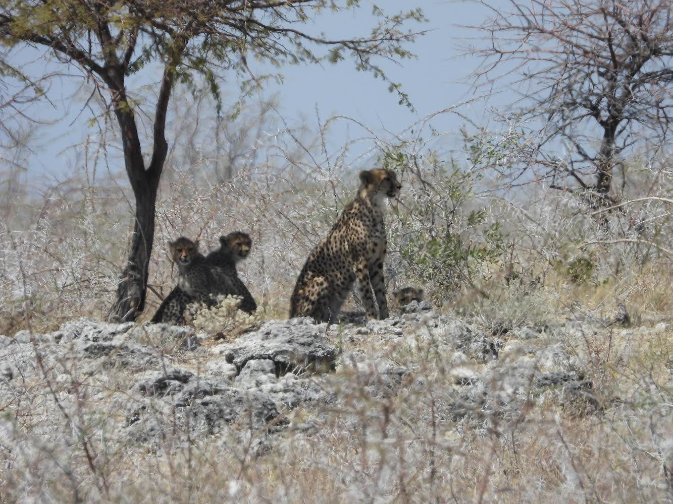 Based on a real life scene witnessed by the founder in the Etosha National Park (see second image) when a mother cheetah just missed a kill of a zebra to feed her three cubs. She was teaching them to hunt. You could tell she exerted so much energy in the miss, so she took a break under this little tree. Although she looked a little winded, she sat steadfast and kept scanning the horizon for another opportunity. You could feel her resolution to finish the job and feed her family in how she was sitting. Nature is amazing!