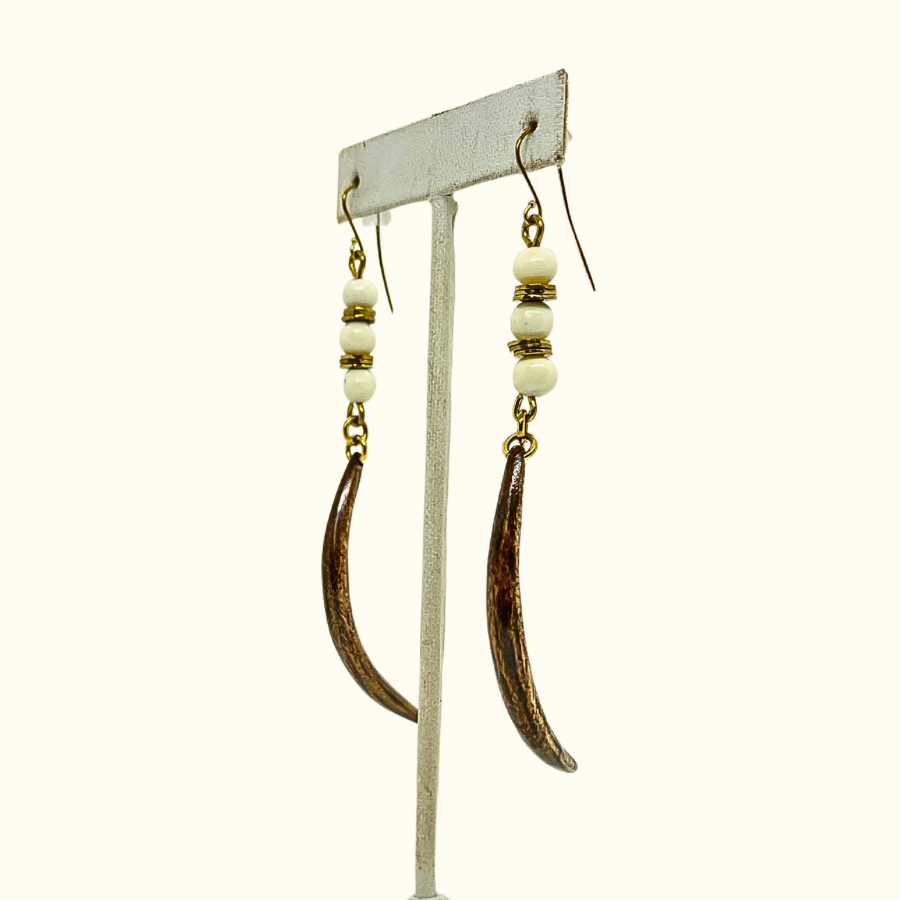 Experience the unique blend of elegance and wild beauty with our Zebra Crescent Earrings. Designed to match our statement Zebra Crescent Moon Necklace but can be worn as statement earrings, the featherlight earrings are made of hand hewn bone beads and a coconut crescent moon, adding a whimsical twist to your style.