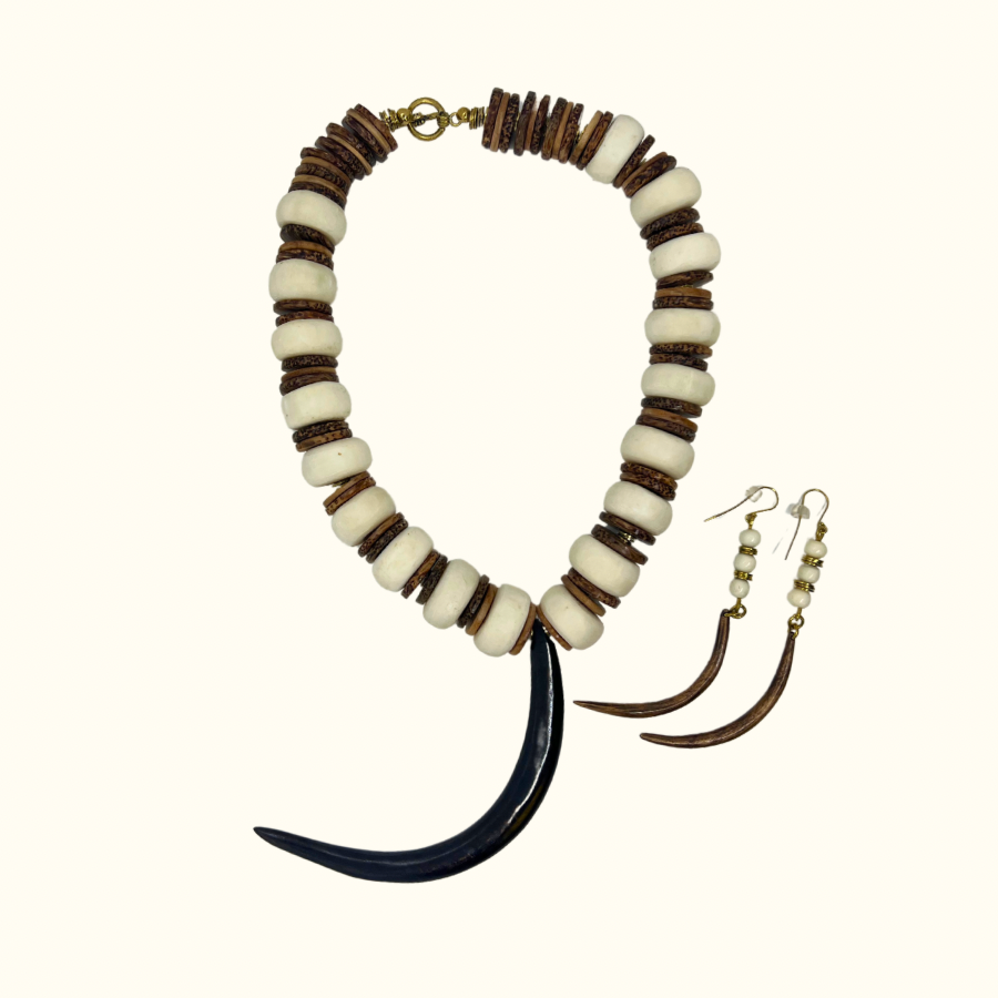 Experience the unique blend of elegance and wild beauty with our Zebra Crescent Necklace and matching earring set. This statement set features hand hewn bone and coconut beads paired with a wood crescent moon, adding a whimsical twist to your style.